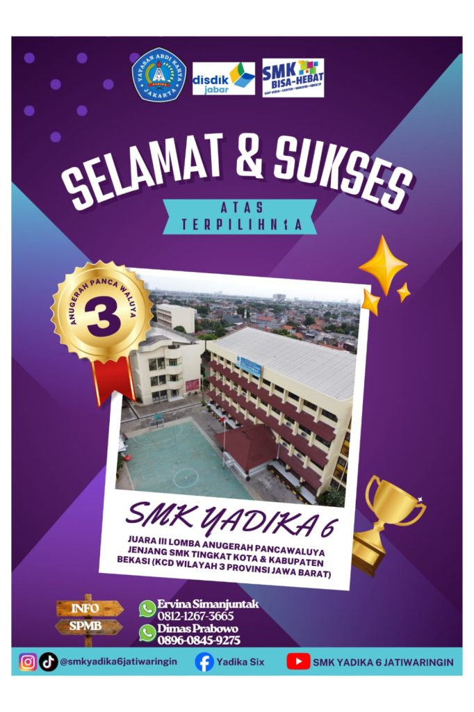 Anugerah Pancawaluya adalah penghargaan dari Pemerintah Provinsi Jawa Barat untuk sekolah-sekolah yang berhasil mengimplementasikan program pendidikan karakter berbasis kearifan lokal Sunda, yaitu Panca Waluya (Cageur, Bageur, Bener, Pinter, Singer), untuk membentuk siswa yang sehat, berakhlak, jujur, cerdas, dan kreatif. Lomba atau anugerah ini mendorong pembiasaan nilai-nilai luhur Sunda di sekolah melalui praktik nyata. SMK Yadika 6 berhasil meraih Juara III jenjang SMK tingkat Kota & Kabupaten Bekasi (KCD 3 wilayah Provinsi Jawa Barat). Semoga tahun depan SMK Yadika 6 dapat meraih yang lebih baik. #gapurapancawaluya #smkswastabekasiterbaik #yadikaterbaik #smkswastaterdekat #pendidikanyadika