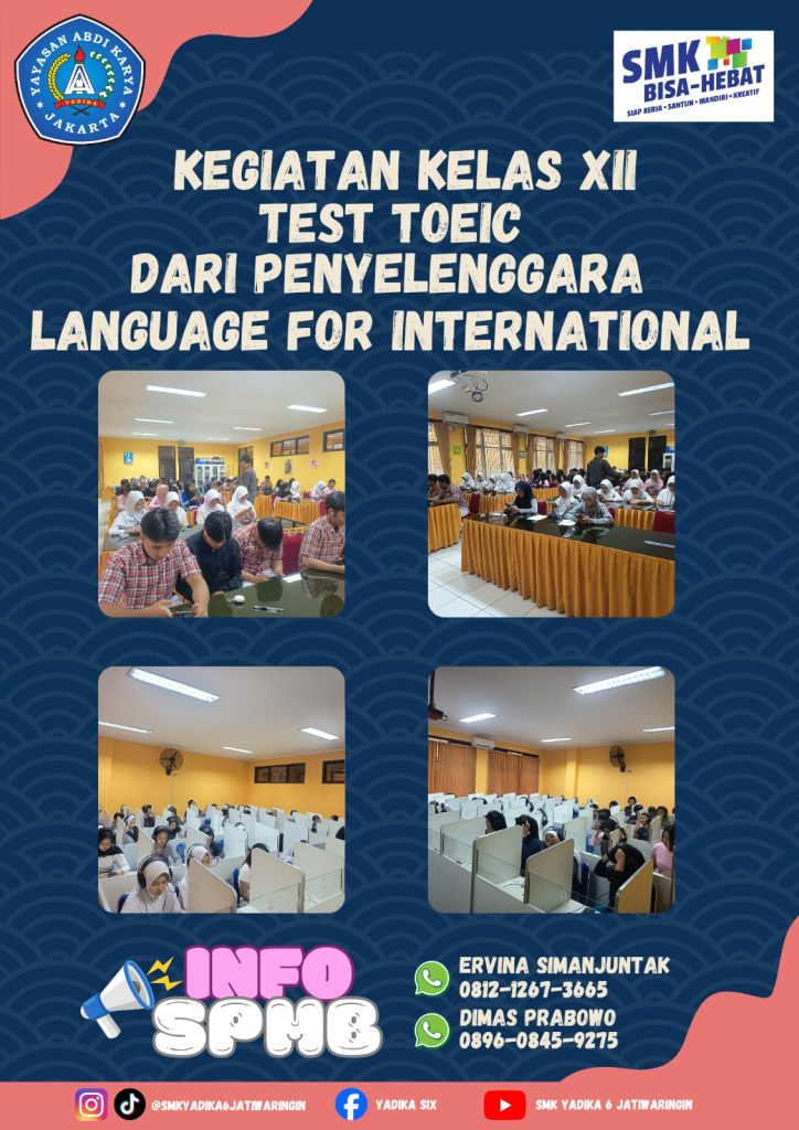 Senang sekali dari tim Language for International dapat kembali berkolaborasi dengan SMK Yadika 6 dalam pelaksanaan sertifikasi TOEIC. 📝✨ ​Melihat antusiasme para siswa/i kelas XII dalam mengukur kemampuan bahasa Inggris mereka adalah bukti nyata komitmen SMK Yadika 6 dalam mencetak lulusan yang siap bersaing di kancah global. Sertifikasi internasional bukan lagi pilihan, tapi kebutuhan! ​"Siap Lulus, Siap Melangkah Lebih Jauh!" ​Ingin mengasah skill bahasa Inggris dan kompetensi globalmu ke level berikutnya? Jangan lewatkan kesempatan bergabung bersama SMK Yadika 6! Cukup DP Rp 1.500.000 kalian sudah resmi menjadi siswa/i SMK Yadika 6 & dapatkan cashback yang menarik. Jadi tunggu apalagiii 😊 ​#smkterdekat #smkswastabekasiterbaik #sekolahterbaik #smkswastaterdekat #yadikaterbaik #pendidikanyadika